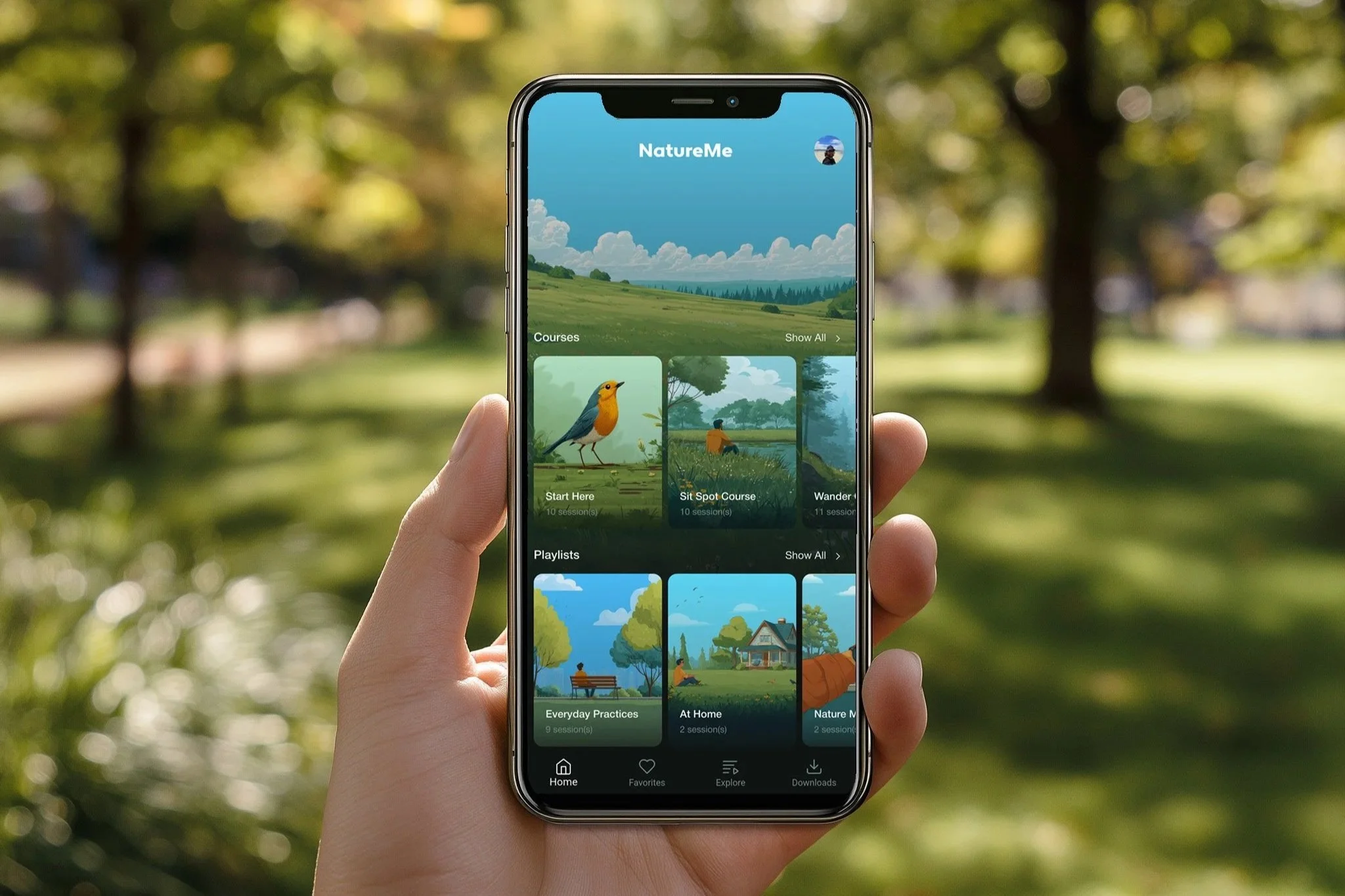 The NatureMe app is a simple way to help people enjoy nature in their everyday lives. Through short, guided audio practices, it encourages you to step outside, slow down, and use all your senses to notice what’s around you. Whether you’re on a city balcony, walking your dog, or sitting in your backyard, NatureMe helps you experience the natural world with the same kind of curiosity and joy you felt as a child.